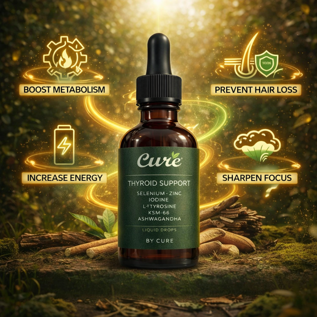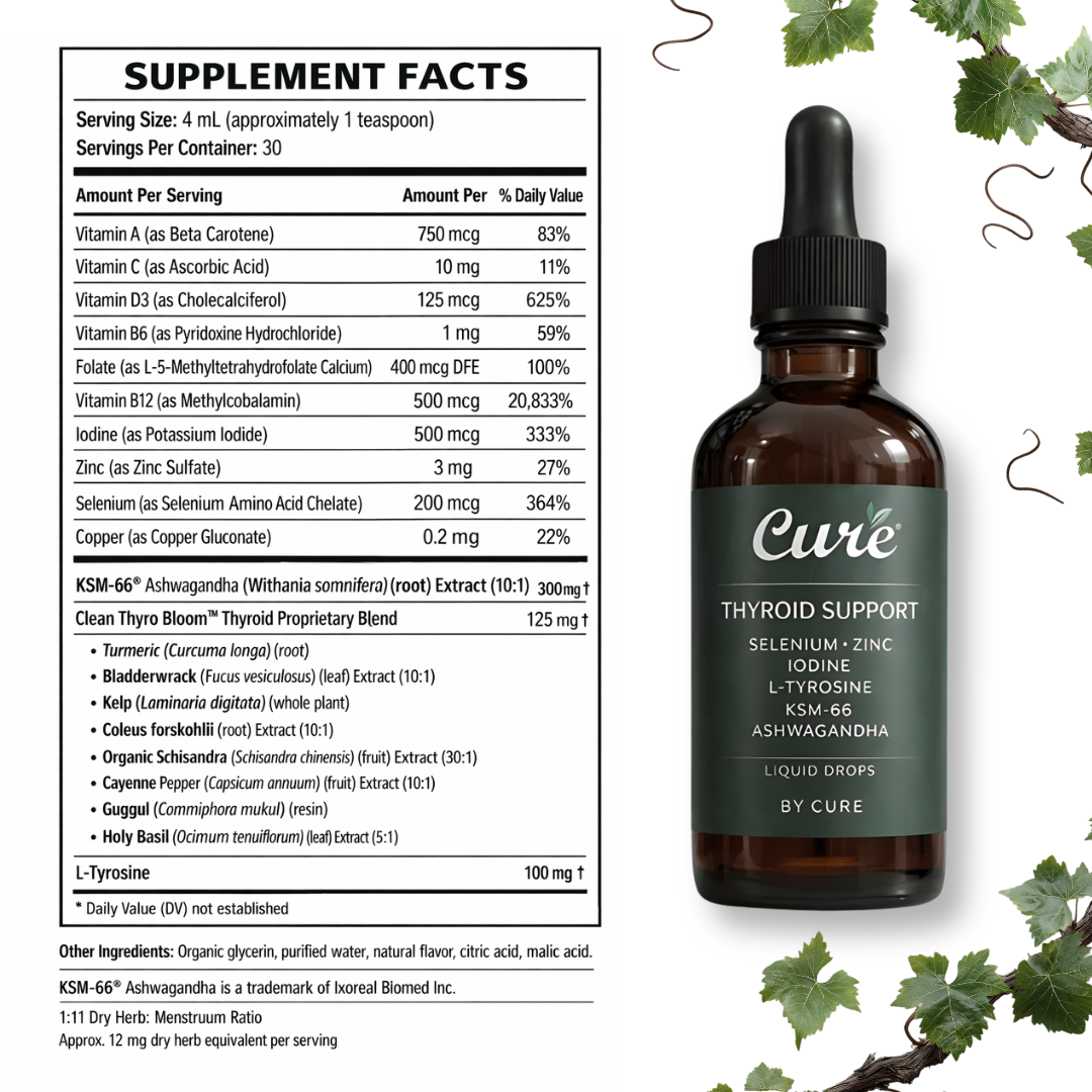 Take 2ml drops daily with food, preferably in the morning. For best absorption, take Cure™ at least 4 hours apart from any thyroid medication (like Levothyroxine or Synthroid). Consistency is key-daily use for 90+ days delivers the best results.